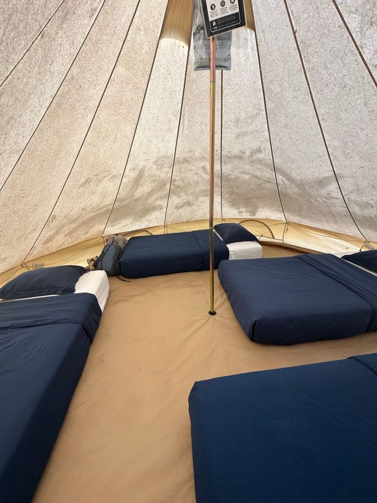 I chose the shared tent—$20/night—for the budget experience. It’s basic: four floor mattresses under a tarp with a small trash can and no lockers. I kept my valuables with me at all times. It was pleasant during my visit (70s°F), but I’d definitely opt for a casita if I came during hotter months. No fans or A/C in any rooms, so keep that in mind.