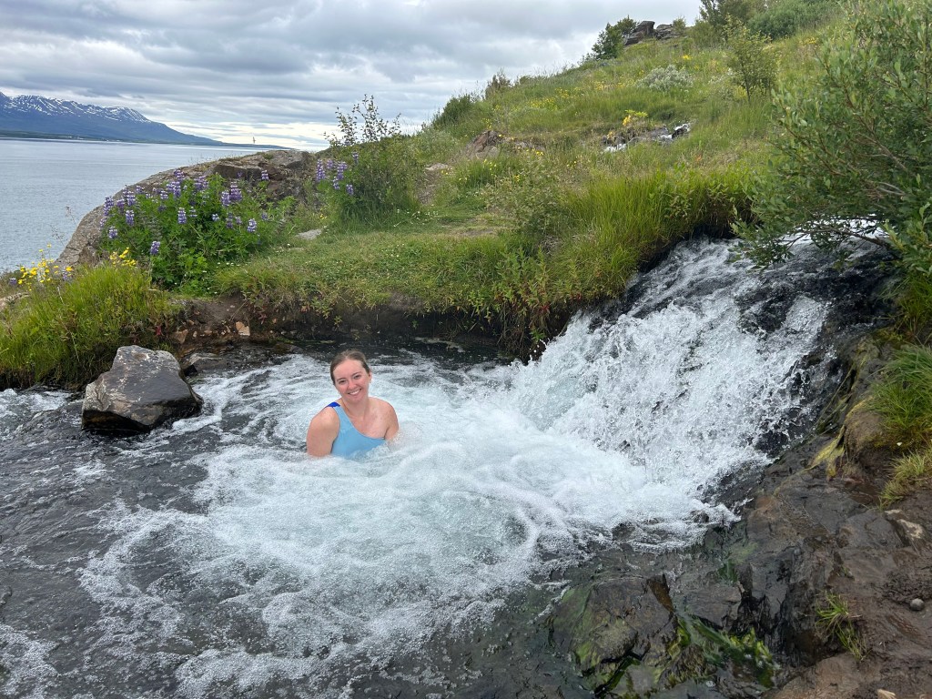 We started the day with a scenic 1.25-hour drive from Mývatn to a hidden gem near Akureyri: Foss, a natural hot spring tucked into the hillside with a view that feels like something out of a fantasy novel. Nestled just above a cascading waterfall, this hot spring is both remote and rewarding. Getting there required parking otherwise in the middle of nowhere (and GPS cooperation), the term “hot spring” was generous, maybe lukewarm. I was freezing. However, I’ll never forget the experience or view and I’m sure the water temperature fluctuates often. I’ve marked this location on my google maps guide.