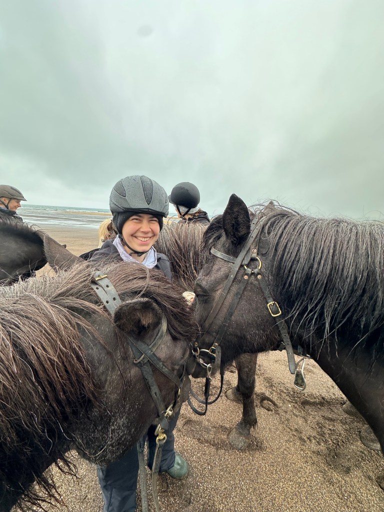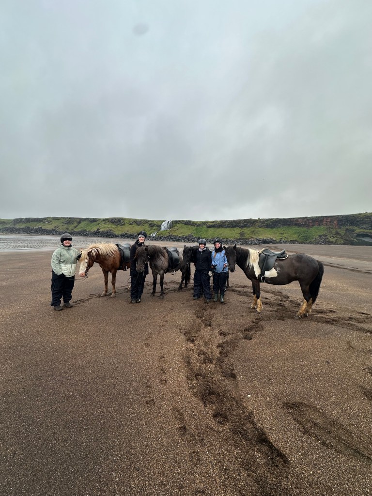 We hit the road early, leaving around 8:00 AM and making the 45-minute drive to Stóri-Kambur for our horseback riding tour along the black sand beaches. The ride lasted two hours and was one of the most memorable experiences of the trip—despite the rain that stuck with us for most of it. If you’re planning this ride (and you should!), make sure you bring waterproof clothing. Icelandic weather does not care about your outfit choices.